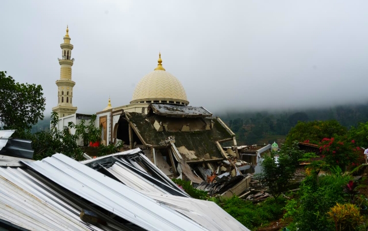 Kondisi Masjid Jami Asy-Syuhada yang sebagian strukturnya runtuh akibat bencana Tanah bergerak. Ist