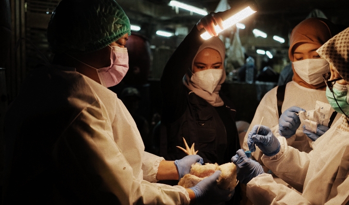 Upaya One Health di Indonesia berfokus pada penyakit zoonosis prioritas seperti flu burung, leptospirosis, antraks, dan rabies. Dalam foto ini, tim gabungan Kementerian Kesehatan RI–WHO melakukan surveilans di pasar unggas di Surabaya sebagai bagian dari program percontohan di lima provinsi pada tahun 2025. Foto: WHO/Fieni Aprilia
